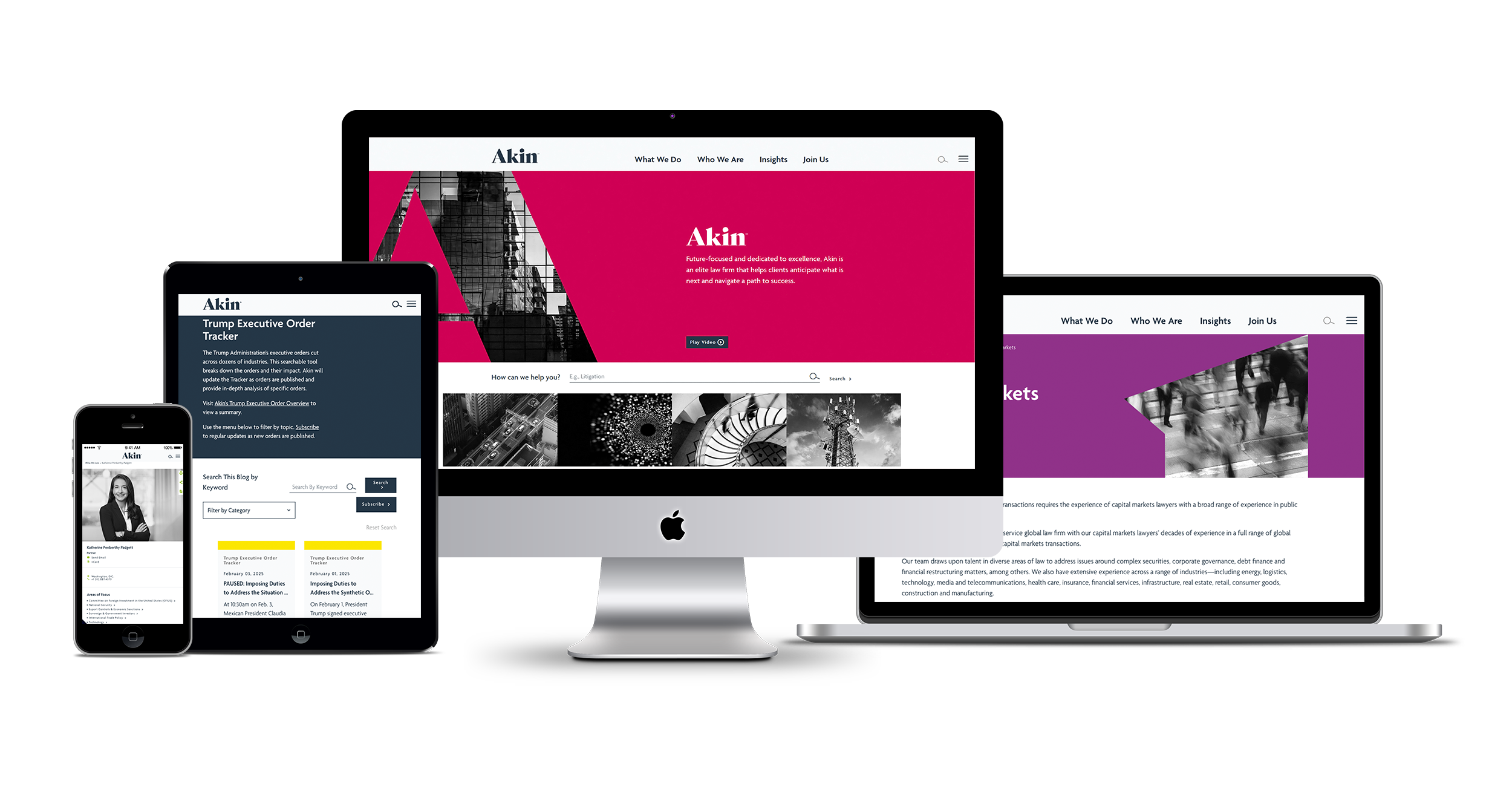 This exciting project culminated in mid-2023 with the complete overhaul of the firm’s brand, including a name change to “Akin,” and a comprehensive redesign of AkinGump.com. Today, the award-winning website is recognized for its vibrant colors, human, approachable design sensibility, and streamlined organization, which help visitors quickly and easily navigate to their desired destination.