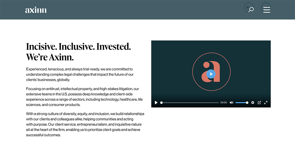 Leveraging the power of the RubyLaw Super Template, Axinn can easily create unique pages that showcase the firm’s exciting new branding. The Super Template’s modular design balances flexibility and constraint, adhering to the brand standards while allowing the team to experiment with different layouts to create dynamic, new content sections on the site. Elements like video and animated links bring visual interest to key pages, including About Us and Careers.