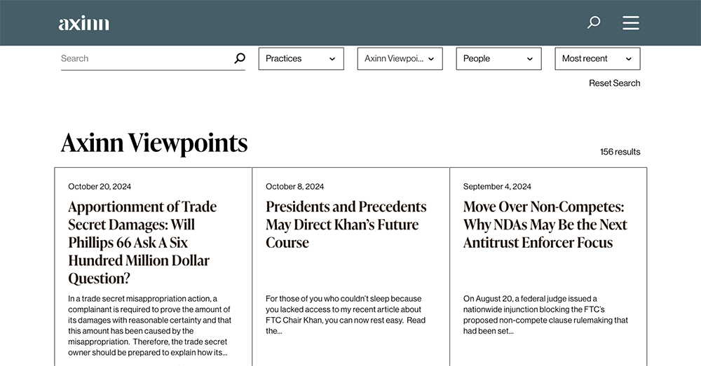 Axinn publishes extensive thought leadership in its three main focus areas. The firm's partnership with Passle (a platform that helps law firms create and distribute online content) enabled stakeholders to continue publishing timely insights effectively. Before the rebuild, this content was branded differently at a separate URL. RubyLaw fully integrated this content, which improved SEO, and displayed it within Axinn's robust Insights section along with the firm's other news and events information.