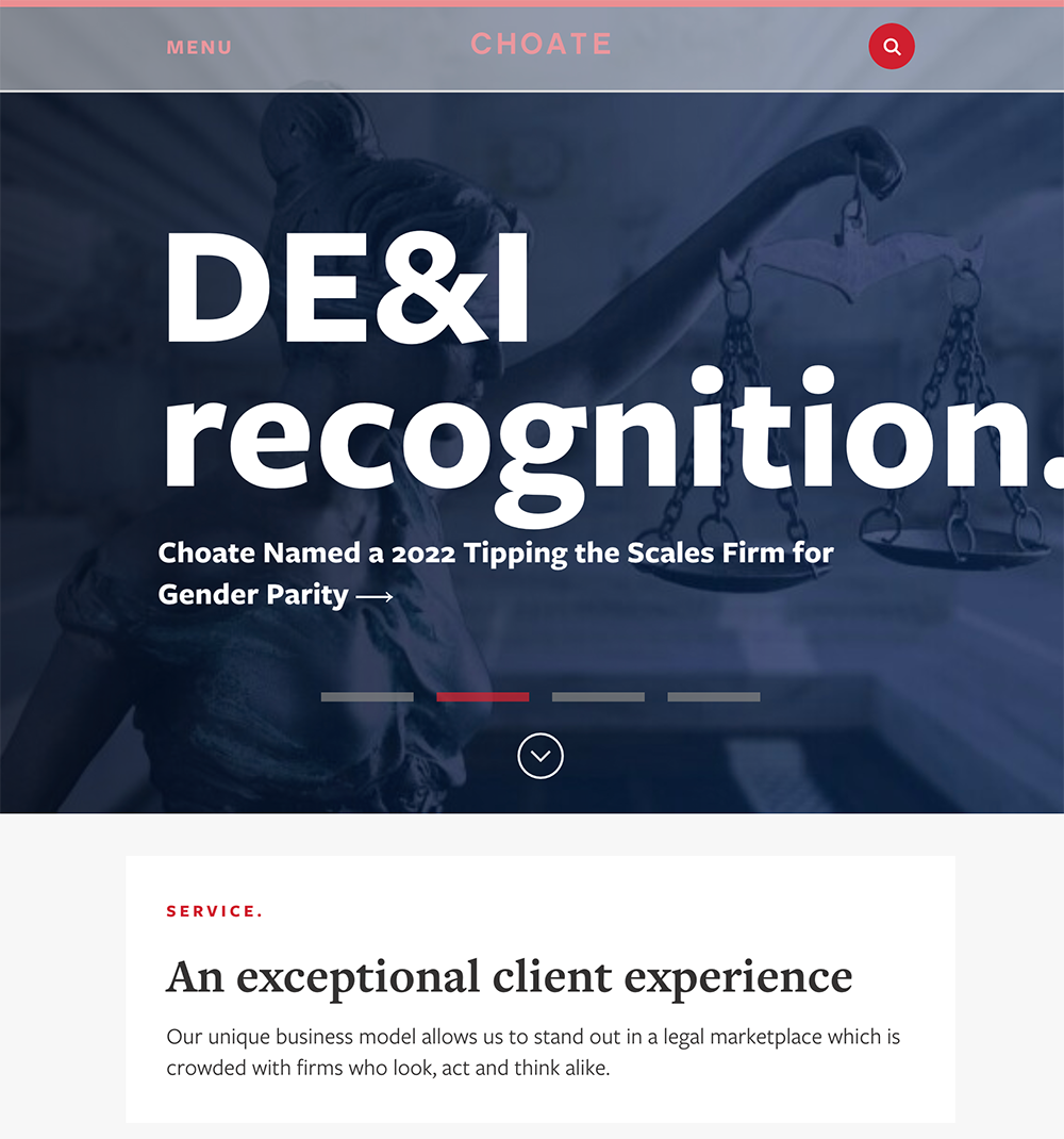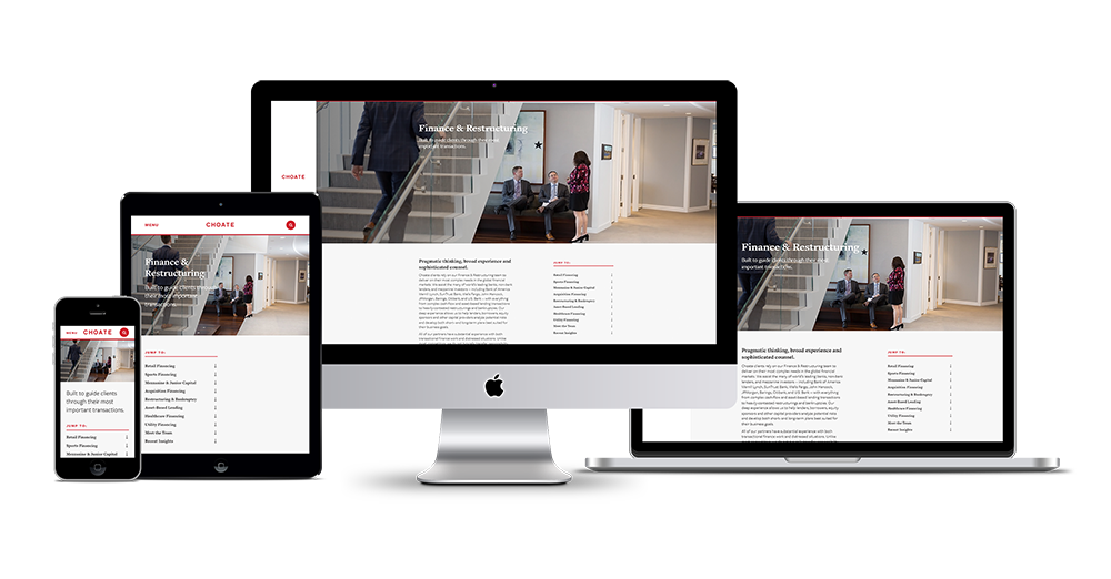 The effort began with a comprehensive re-imagining of Choate’s practice organization. What was previously more than 250 discreet practice areas, we strategically focused down to five. We then collaborated with Choate to introduce Areas of Focus to expand their Services offering and go-to-market strategy. This helped simplify the information architecture of the eventual RubyLaw-powered website, making the navigation easier to manage and increasing the likelihood of longer site visits.