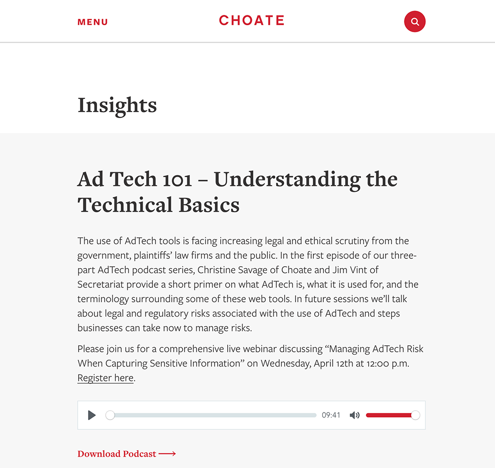 Seeking a sophisticated approach to align the firm’s marketing with its ambitions and with significant technology and security requirements to boot, Choate selected RubyLaw to support its new digital marketing ecosystem confidently. Further, the firm sought a recommendation from our team for a creative agency to provide the design solution. For this, we relied on our extensive portfolio of creative partners and provided a recommendation to meet Choate’s criteria.