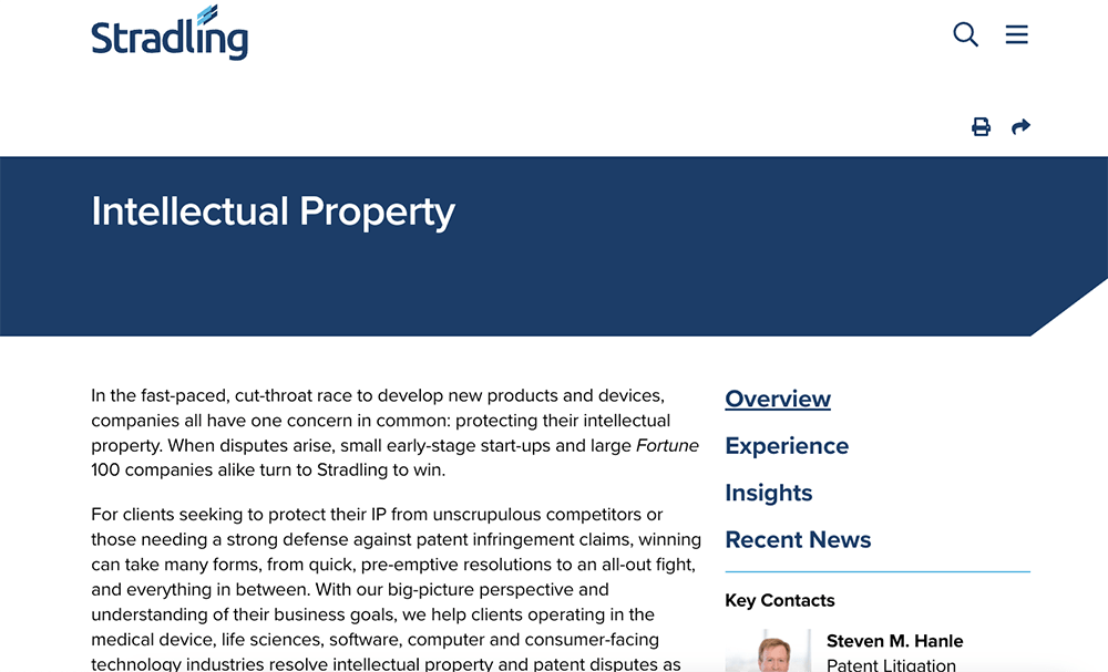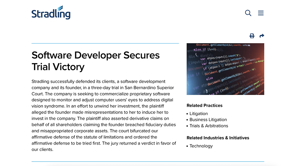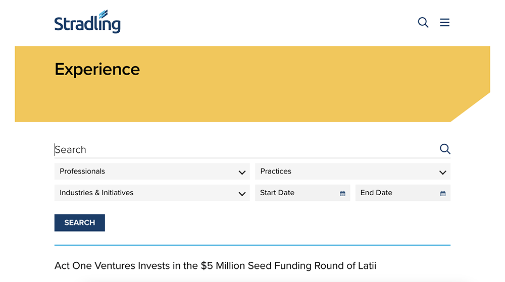 The website also has a robust Experience section powered by RubyLaw Experience and controlled by the Stradling marketing and business development teams. They can manage all of their matters in one place and decide which gets posted to the site. Visitors can then search for relevant matters that match their needs. These matters can be related throughout the site to various pages, including biographies and practices.